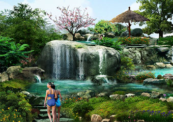 户外温泉建筑面积约15000平方米,以生态自然、休闲养生为特色,小桥流水,亭台楼榭,清溪潺潺,花果飘香;雾雨时节,烟霞缥缈,山色苍苍,湖水茫茫;置身其中,宛若蓬莱。